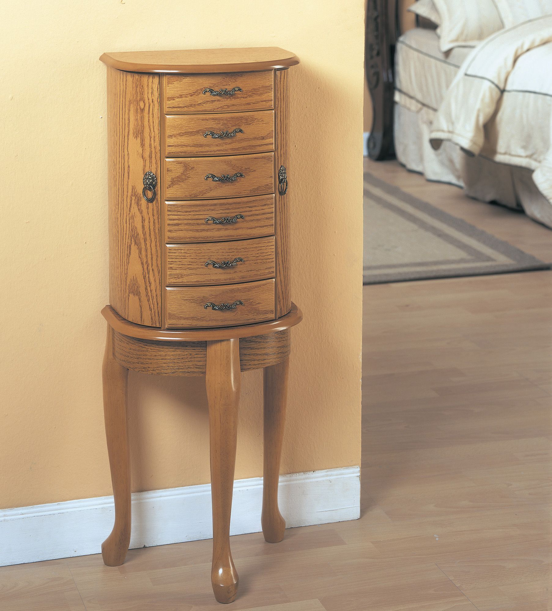 Monarch Specialties Oak Floorstanding Jewelry Armoire I 1044 : With timeless appeal, this jewellery armoire is the ideal place to store your valuables and keepsakes. Black felted drawers too as a flip top mirror provide ideal space for storing rings, earrings, bracelets. Two side doors swing out to reveal 3 hooks per side to keep necklaces, lockets and chains neatly organized. basic cabriole legs and rounded drawer fronts, finished in a medium oak are accented with antique hardware for a stylish piece that pairs beauticompletely with traditional styles of decor. We are happy to present the quality Monarch Specialties Oak Floorstanding Jewelry Armoire I 1044 today at this kind of special price.